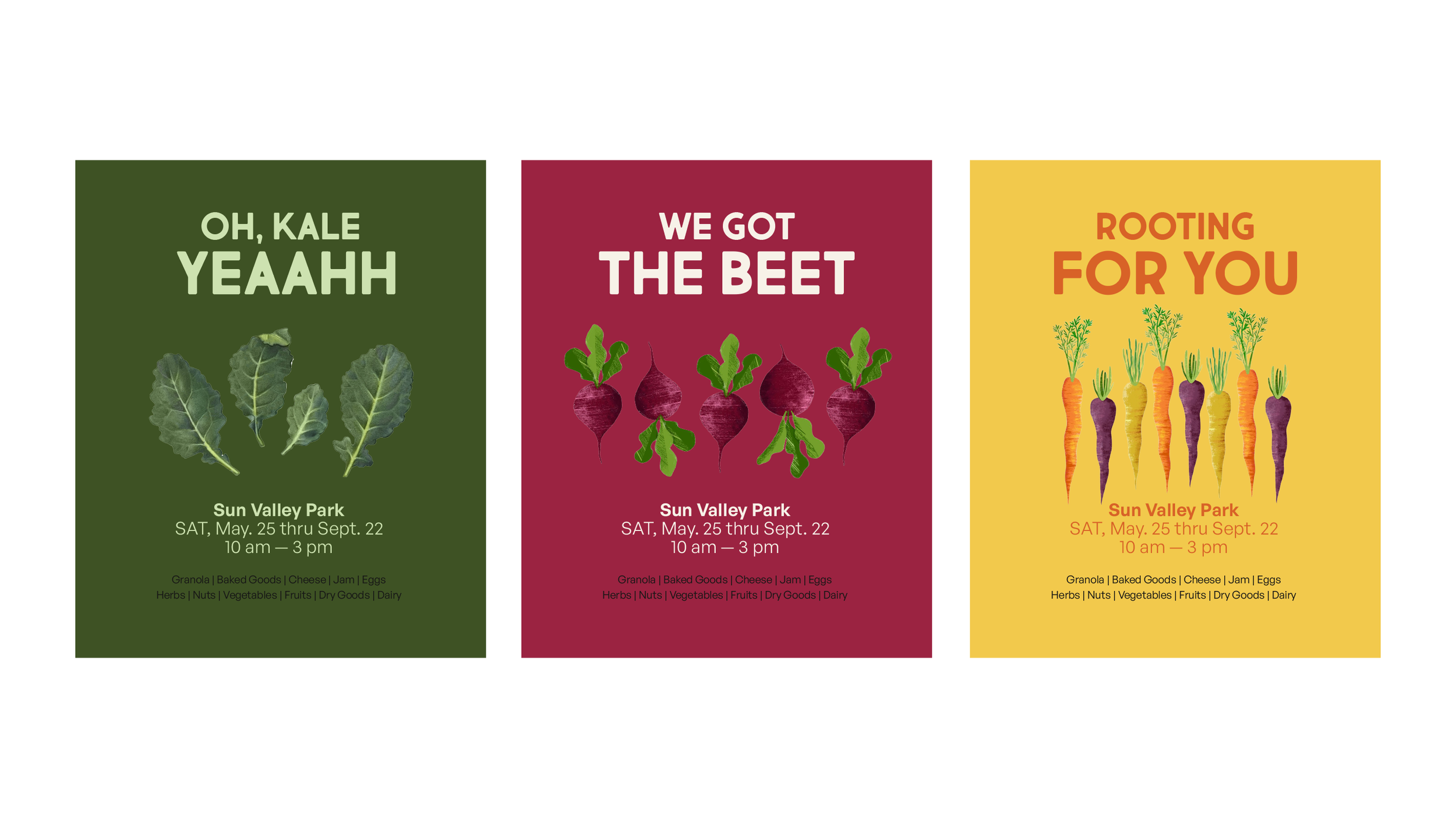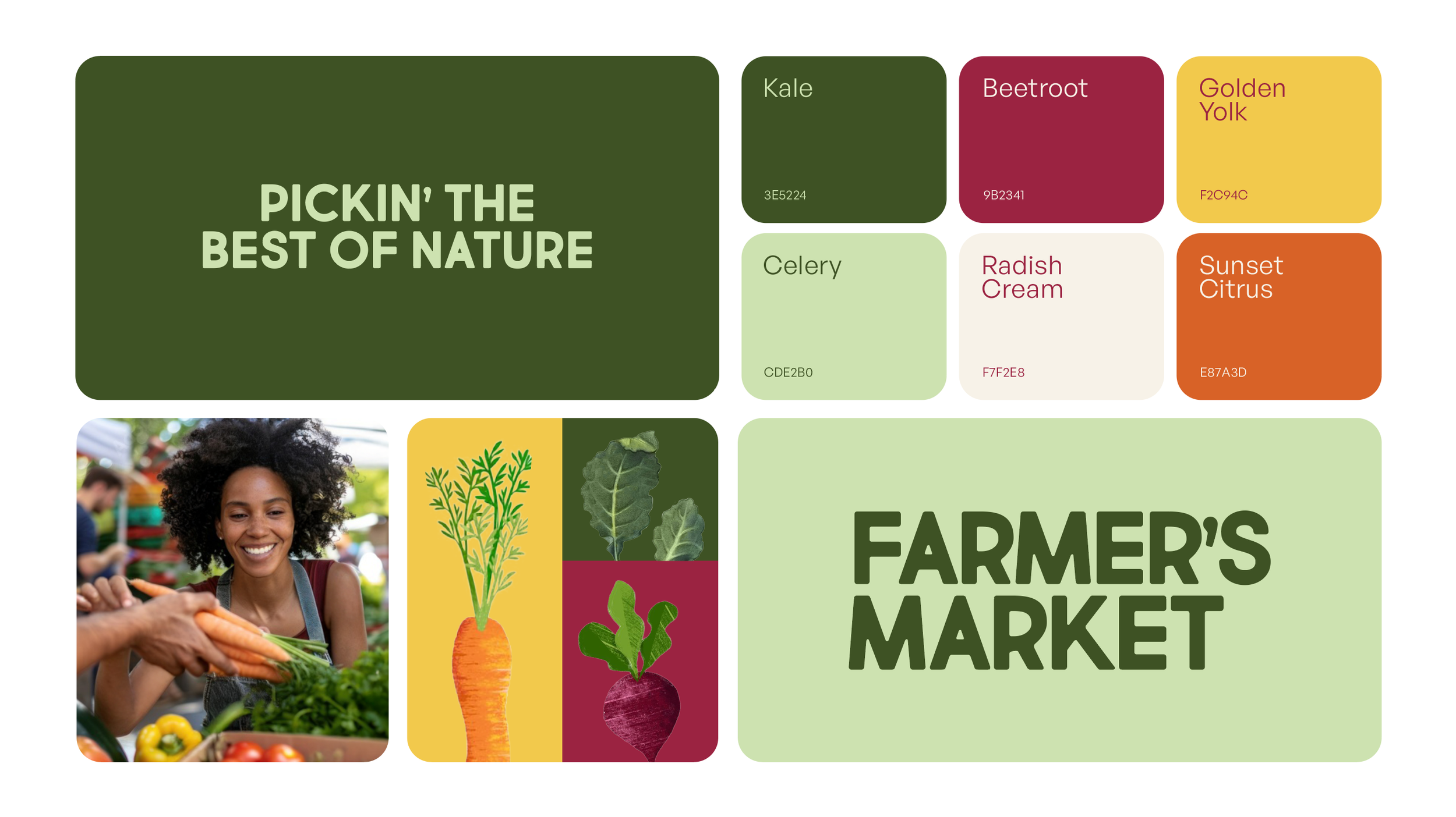 I created a fresh and approachable brand identity for a local farmer’s market. The system includes a bold logotype, playful produce-inspired color palette with names like “Kale” and “Celery,” and clean typography that feels both rustic and modern. Taglines like “Pickin’ the best of nature” and custom illustrations add warmth and personality, making the brand feel rooted in community and grounded in nature.